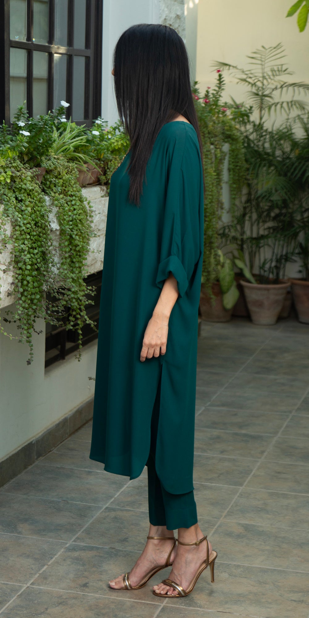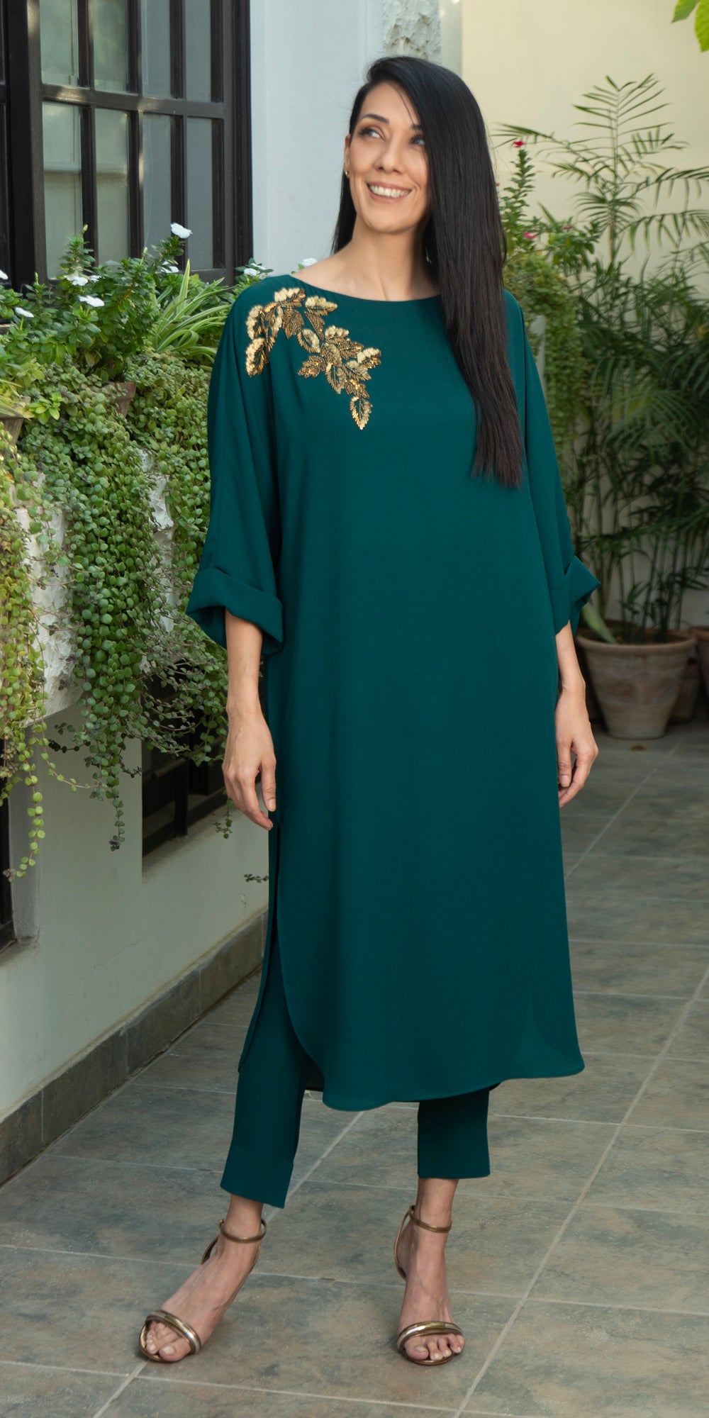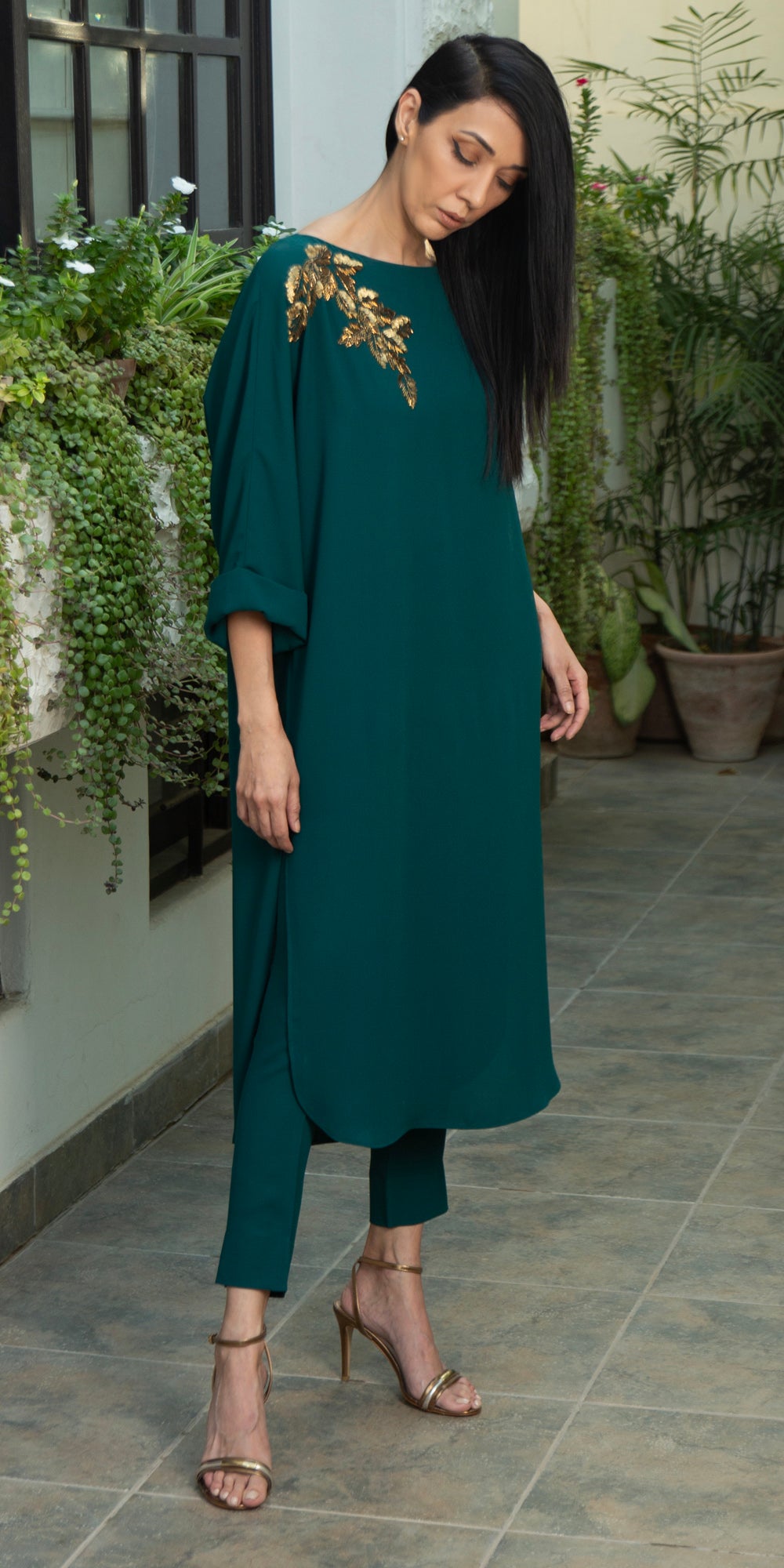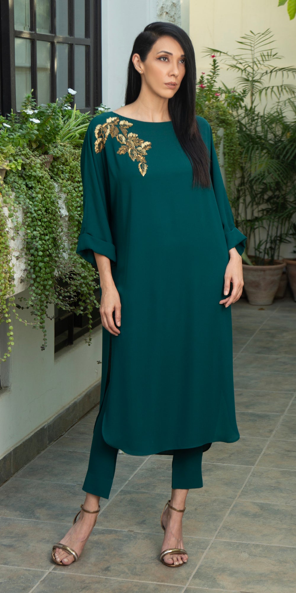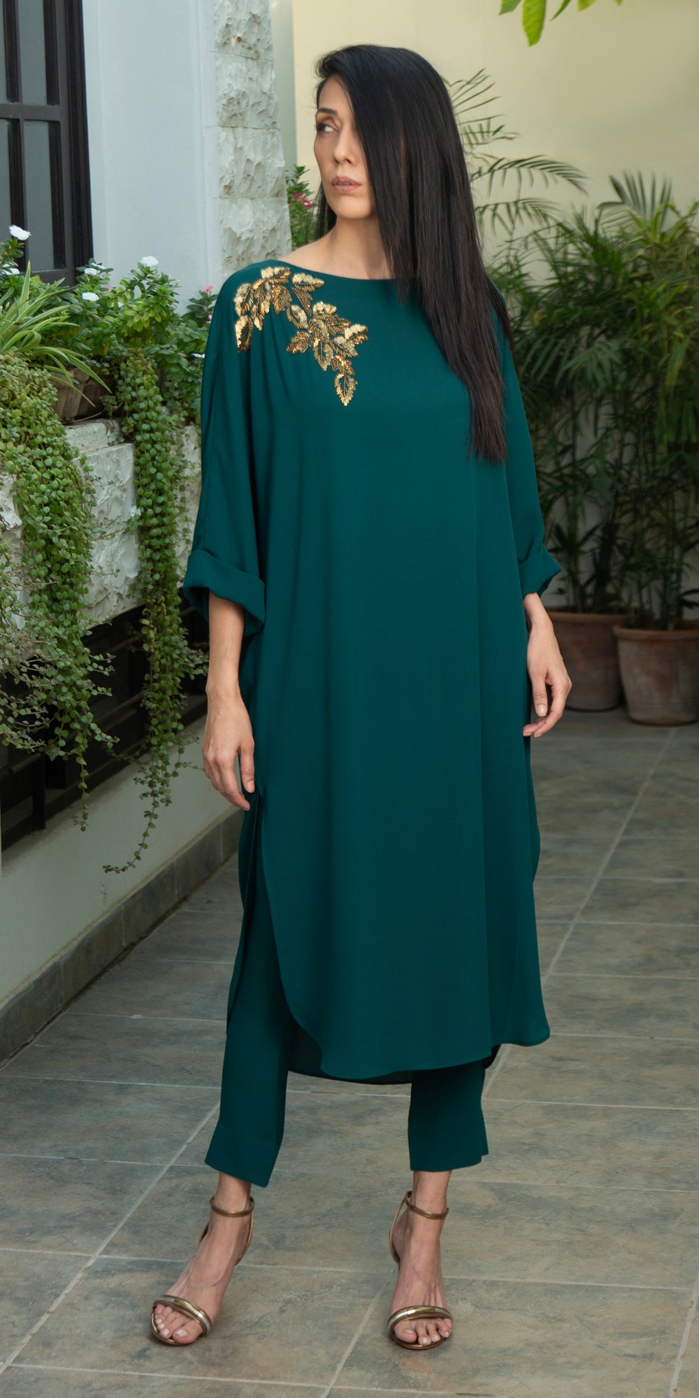 This twin set features a dolman sleeved caftan top with an stunning handworked motif setting off the boat shaped neckline. It has been paired with our slim fit trouser.