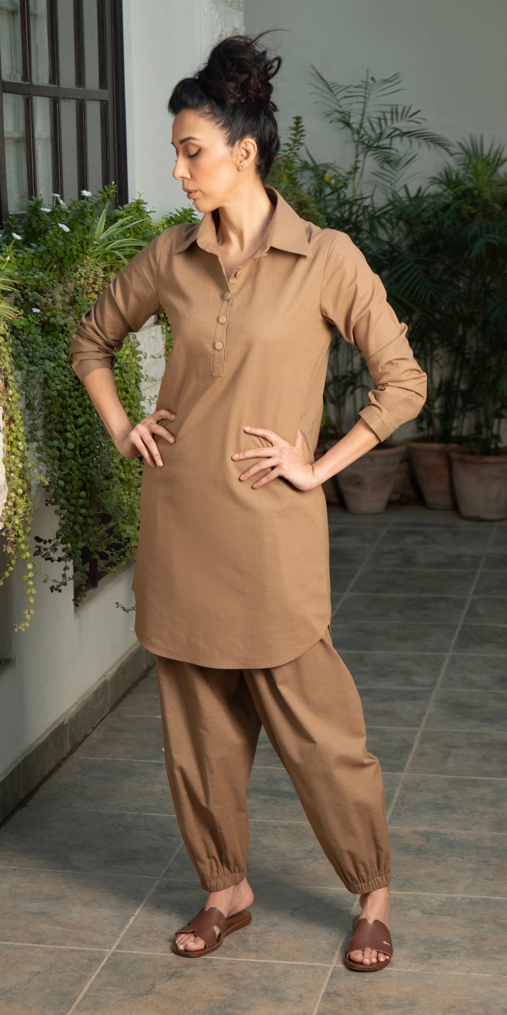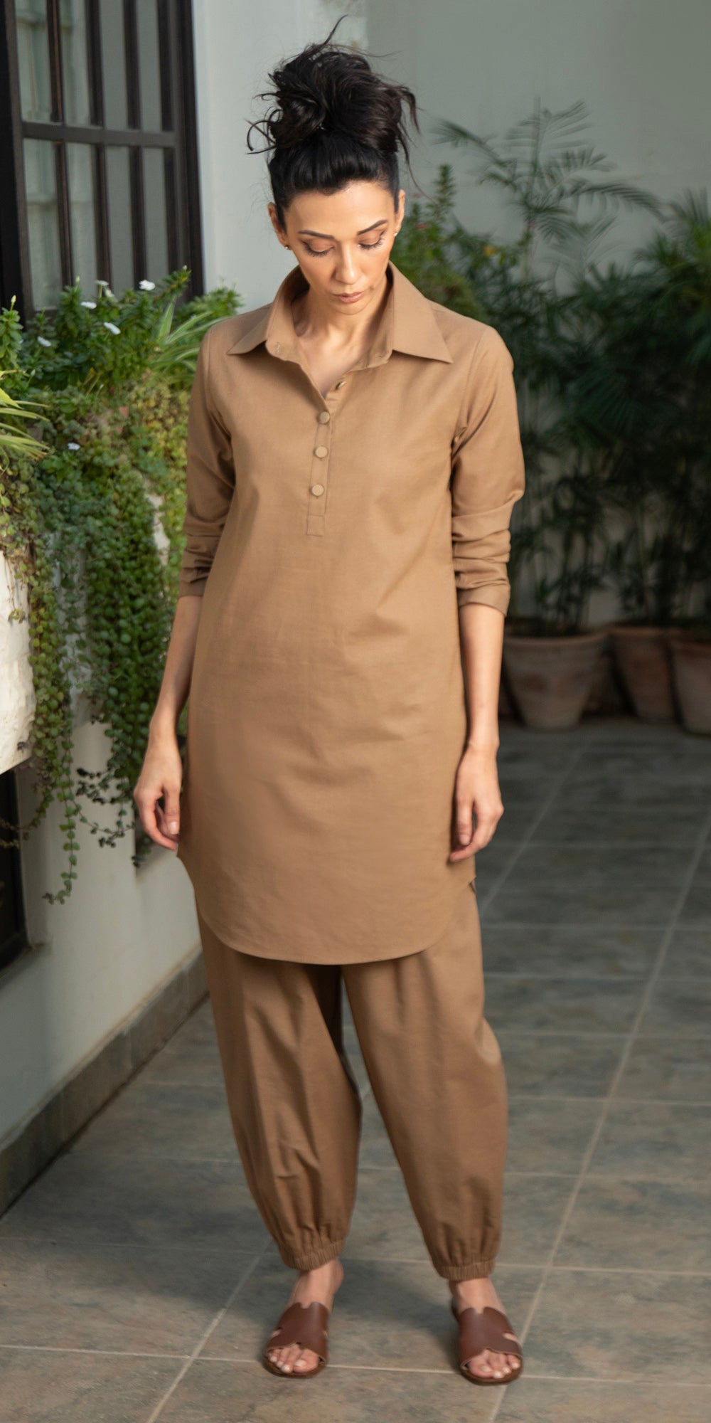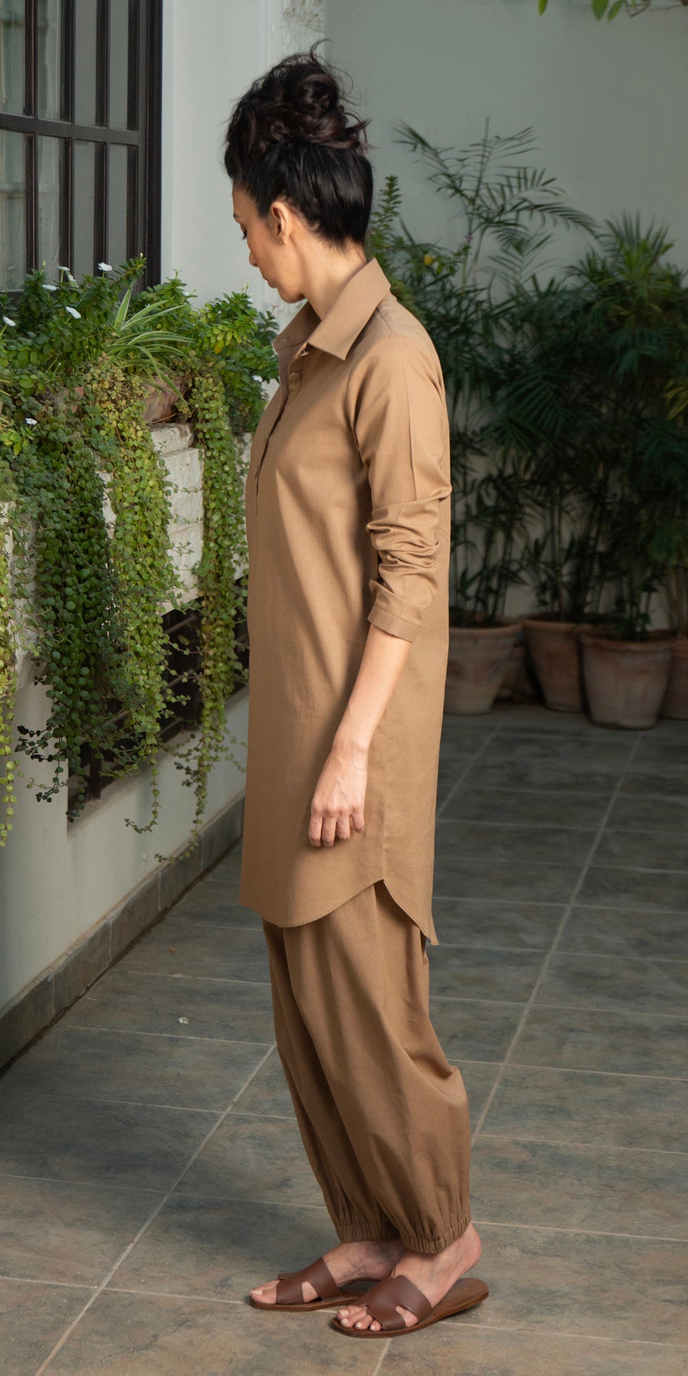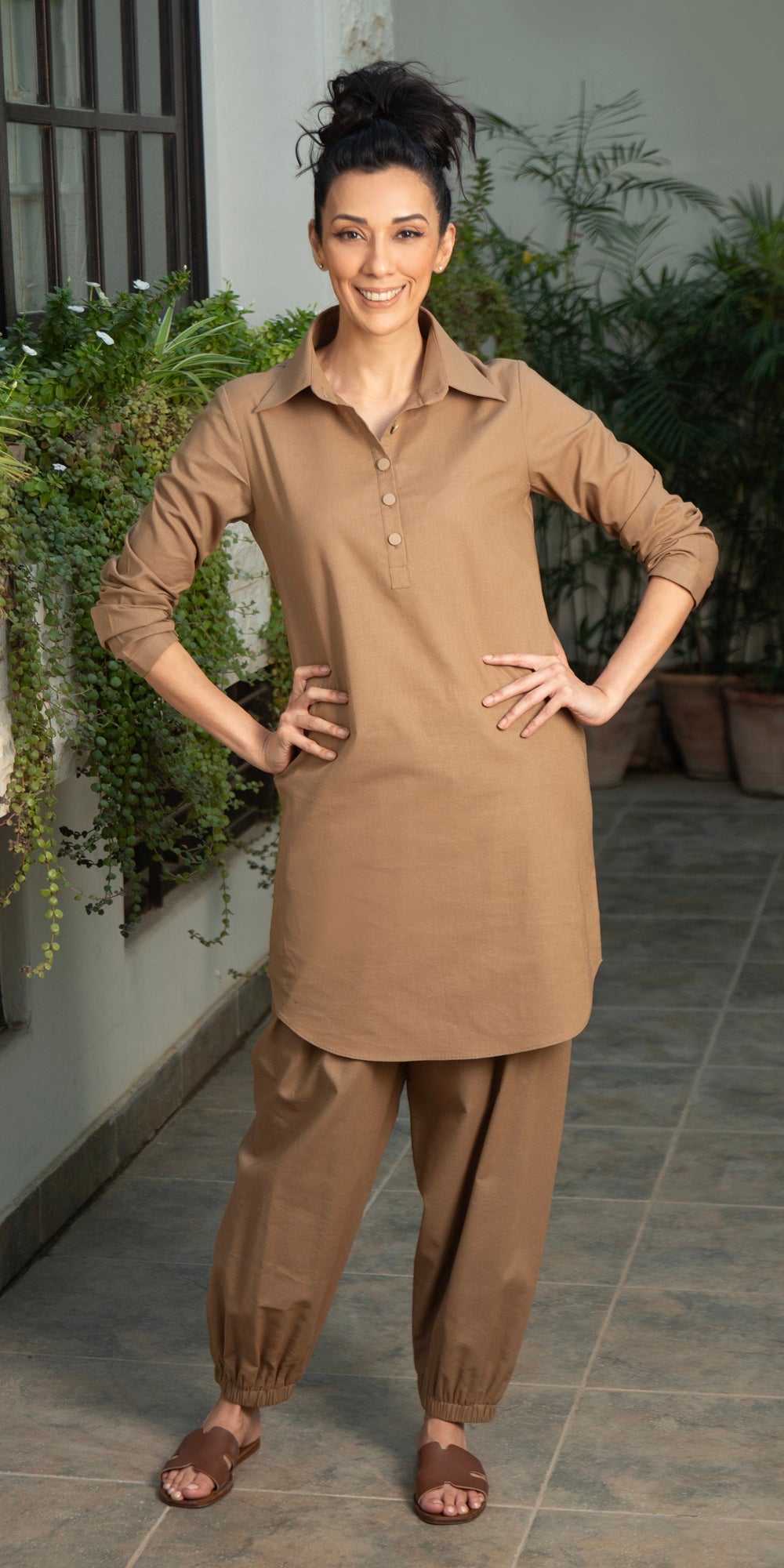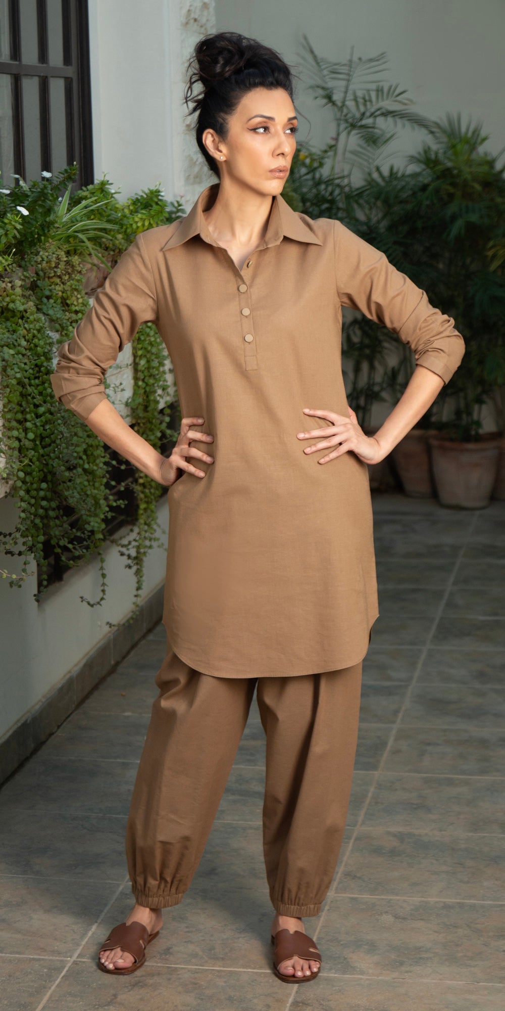 A fabulous twin set featuring a collared tunic with matching button detailing. It has been paired with our signature harem trouser.