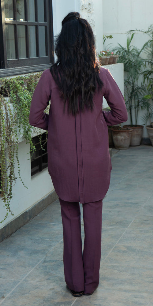 A fabulous twin set featuring a collared button down tunic and a relaxed boot cut trouser.